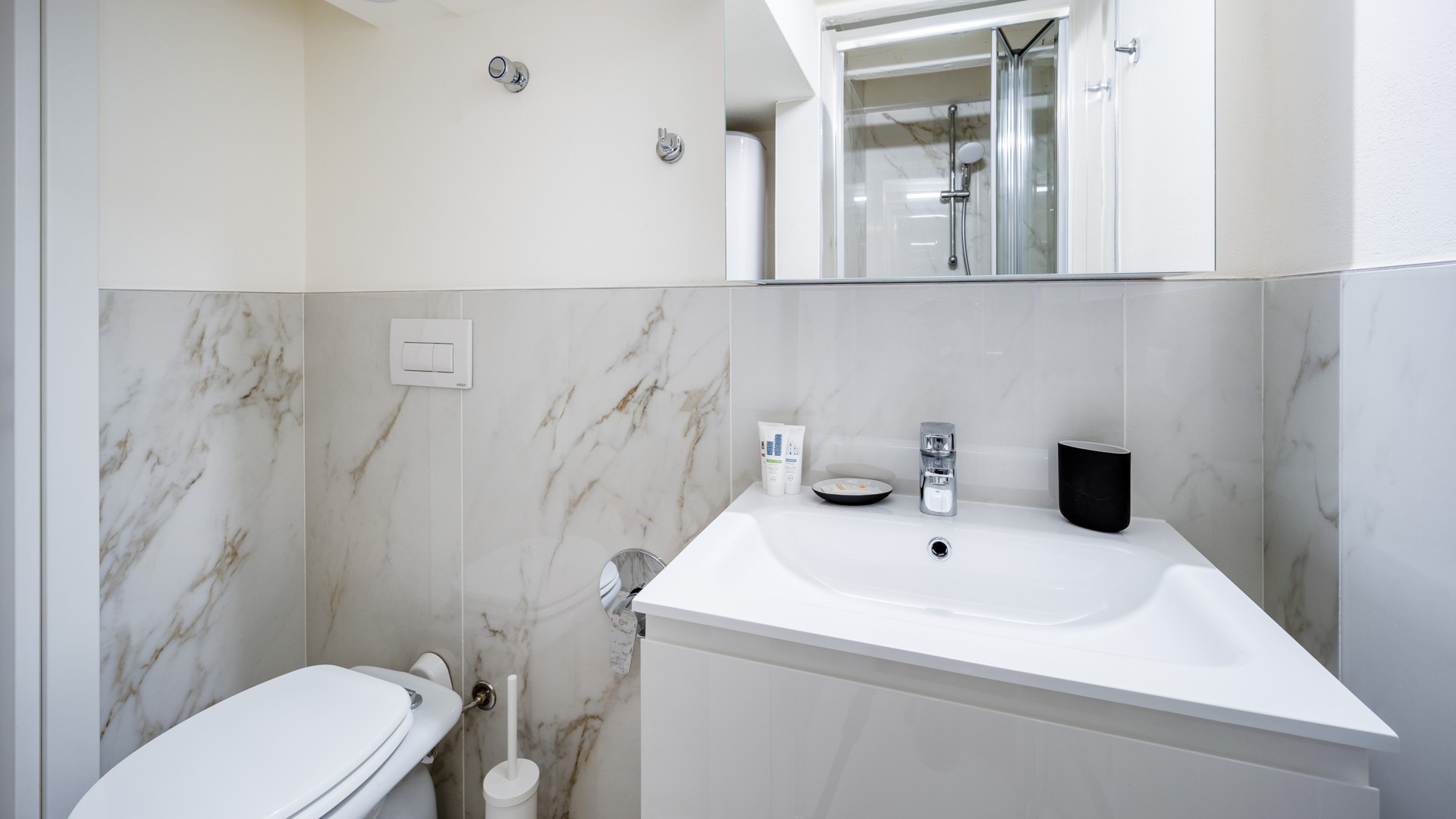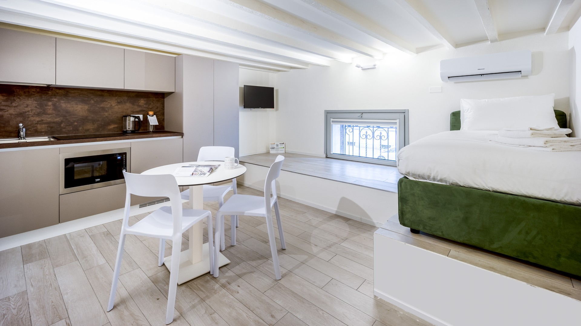 Completamente rinnovato nel 2021, con arredi su misura e finiture moderne, questo appartamento ospita fino a tre persone e offre linea cortesia, asciugacapelli, toaster, wi-fi e aria condizionata. Posizionato sul piano ammezzato, si raggiunge attraverso una rampa di scale interna partendo dal primo piano dell’edificio. Riservato ai non fumatori.