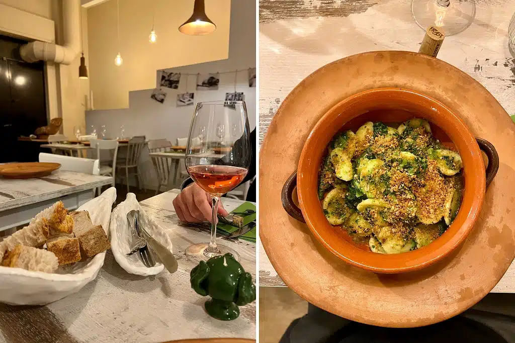 Altri punti di forza: la qualità delle materie prime e la genuinità dei sapori. Il menu ha sei voci fisse: i classici, cioè il tagliere pugliese di salumi e formaggi, le fave e cicorie, le orecchiette, sia al pomodoro e cacioricotta che alle cime di rapa con pane tostato (molto buone), le polpette della nonna e le bombette con patate, friggitelli e salsa al pecorino. E poi ogni giorno diverse proposte “one shot”, tra le quali potrete trovare gli uccelletti in terrina, primi piatti con formati tipici e condimenti sfiziosi, secondi di carne o di pesce. Lasciatevi poi stupire dai dolci, che cambiano sempre. Un esempio? Il frisellamisù. Tra i vini, diverse etichette di cantine pugliesi, tra cui Varvaglione.